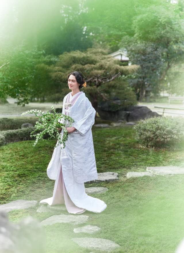 四季の移ろいを感じさせる桜鶴苑に映える伝統ある和装スタイルは