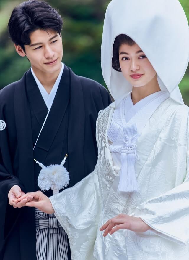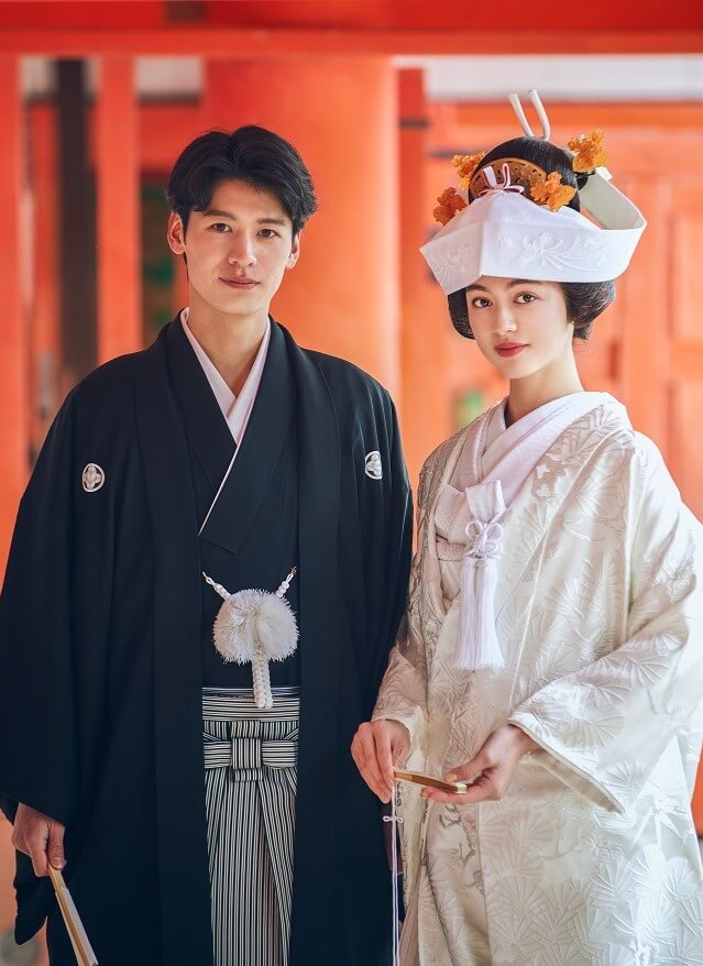 美しく表情を変える花嫁の姿と調和するデザインの紋服とタキシード。